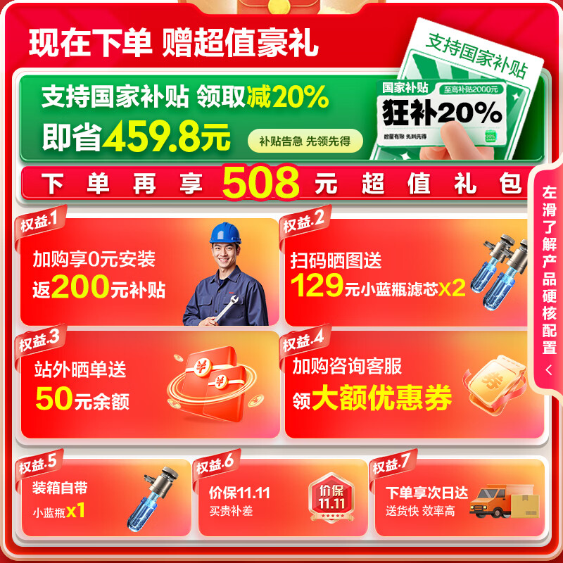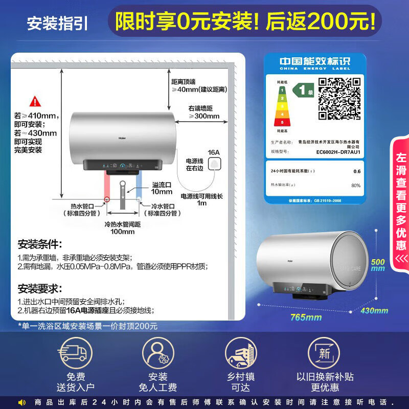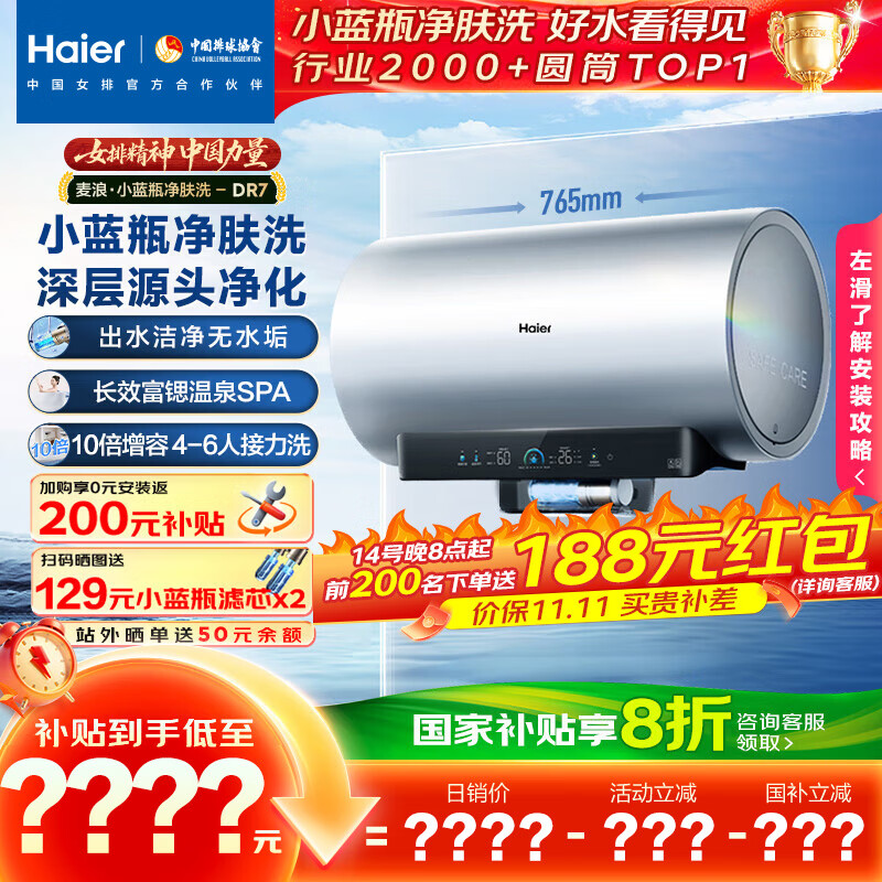 海尔(Haier)麦浪套系电热水器 国家补贴20% 60升DR7 富锶小蓝瓶净肤洗 3300W变频一级能效节能速热大水量家用