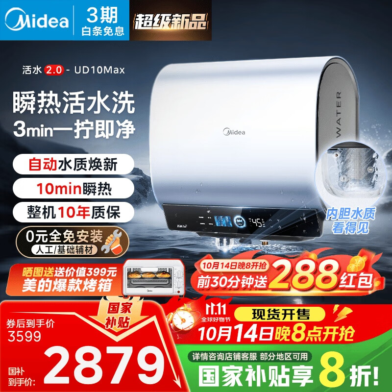 美的(Midea)【美的活水UD10Max】亲肤活水2.0水质可视自动排污60L双胆扁桶电热水器3300W水电分离一级能效瞬热
