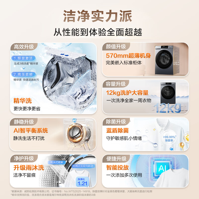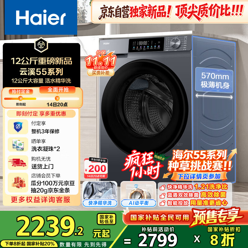 海尔(Haier)滚筒洗衣机全自动12公斤 超薄家用家电国家补贴 京东自营云溪55J7 一级能效以旧换新 内衣洗出租房