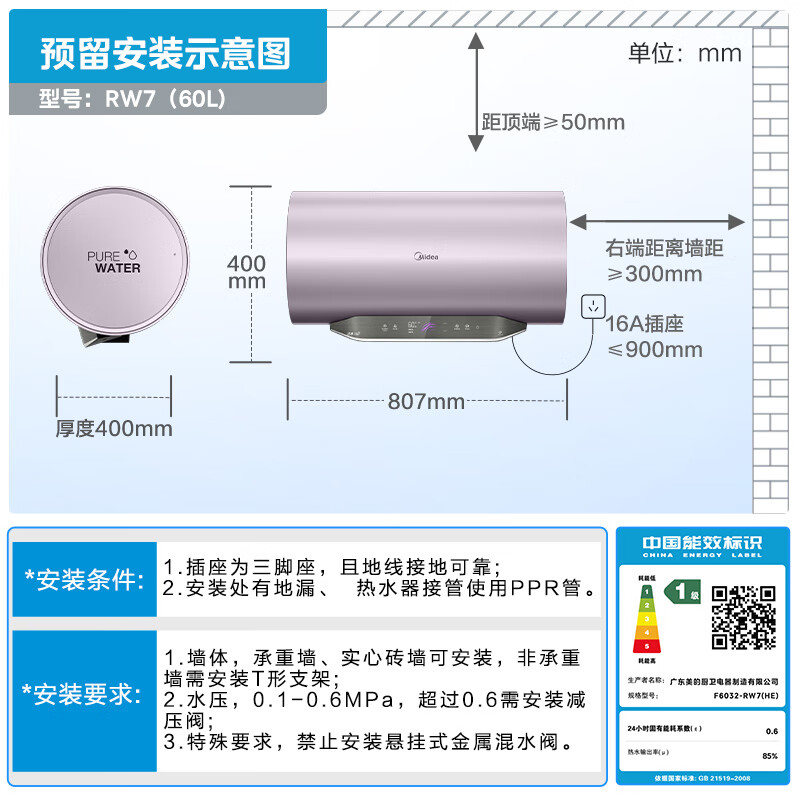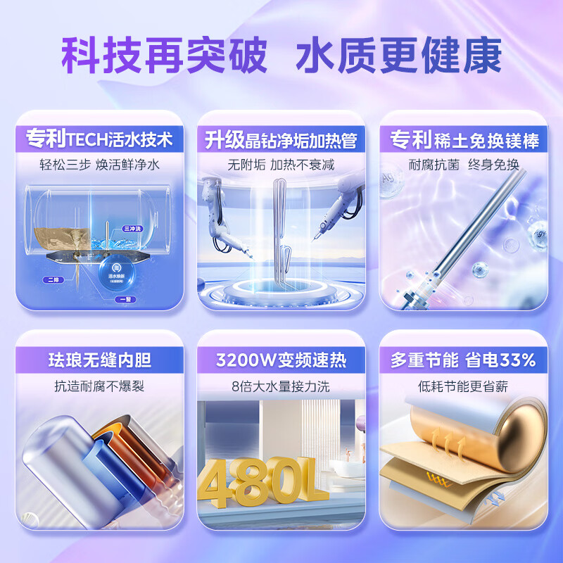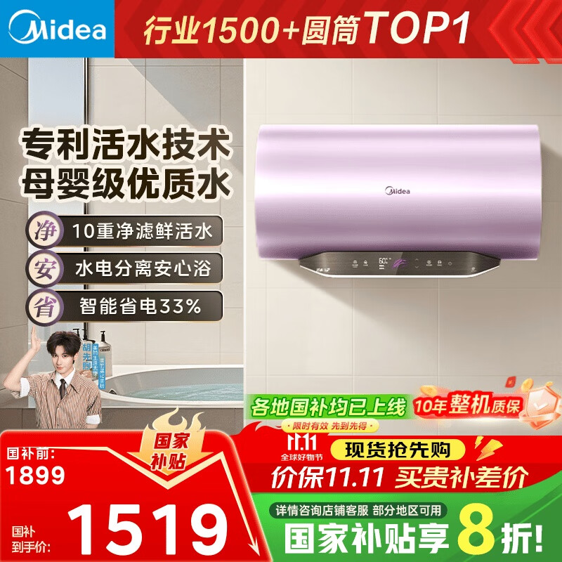 美的(Midea)TECH活水电热水器60升3200W变频速热 10重过滤终身镁棒免更换以旧换新 国家补贴20% F6032-RW7(HE)