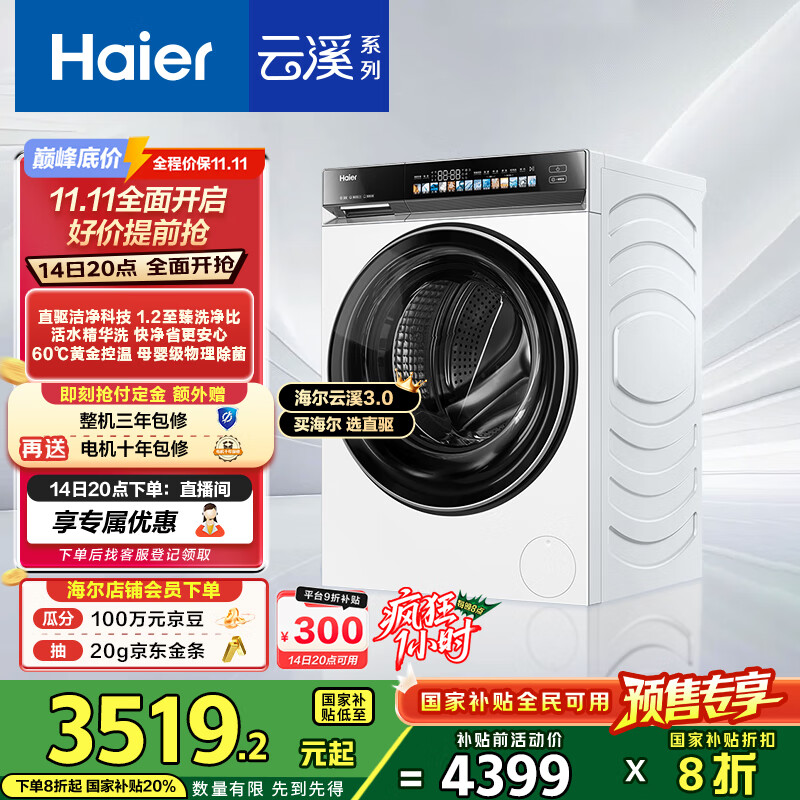 海尔(Haier)云溪3.0滚筒洗衣机全自动10公斤超薄家用家电国家补贴 京东自营直驱583W 一级能效以旧换新内衣洗