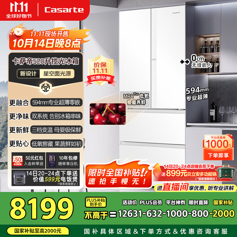 卡萨帝(Casarte)揽光冰箱520升594mm超薄零嵌入式双系统法式多门一级能效国家补贴20%冰箱BCD-520WGCFDM4WKU1