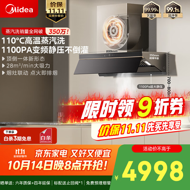 美的(Midea)【蒸汽洗AK7PRO】抽吸排油烟机顶侧一体28大吸力QD529双边定时燃气灶具烟灶【套装商品】