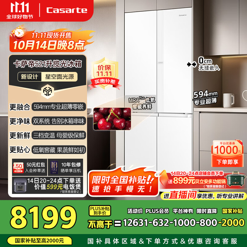 卡萨帝(Casarte)揽光星空版521升594mm超薄零嵌入式双系统十字四开门国家补贴20%一级能效冰箱BCD-521WGCTDM4WKU1