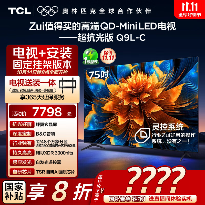TCL 75Q9L-C 包安装版【固定挂架送装一体】75英寸 QD-Mini LED电视 Q9L超级抗光版 国家补贴