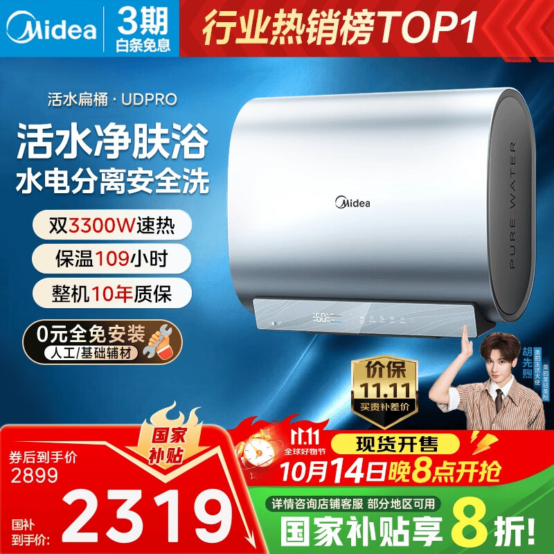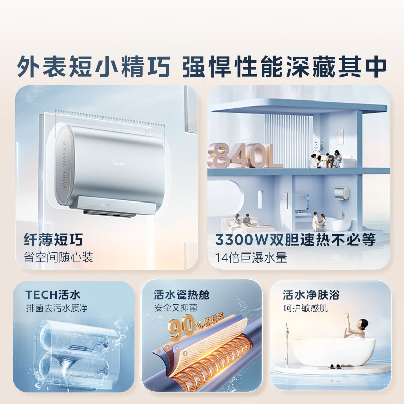 美的(Midea)TECH亲肤活水玲珑超薄80升双胆扁桶电热水器3300W速热水电分离一级能效UDpro国家补贴以旧换新