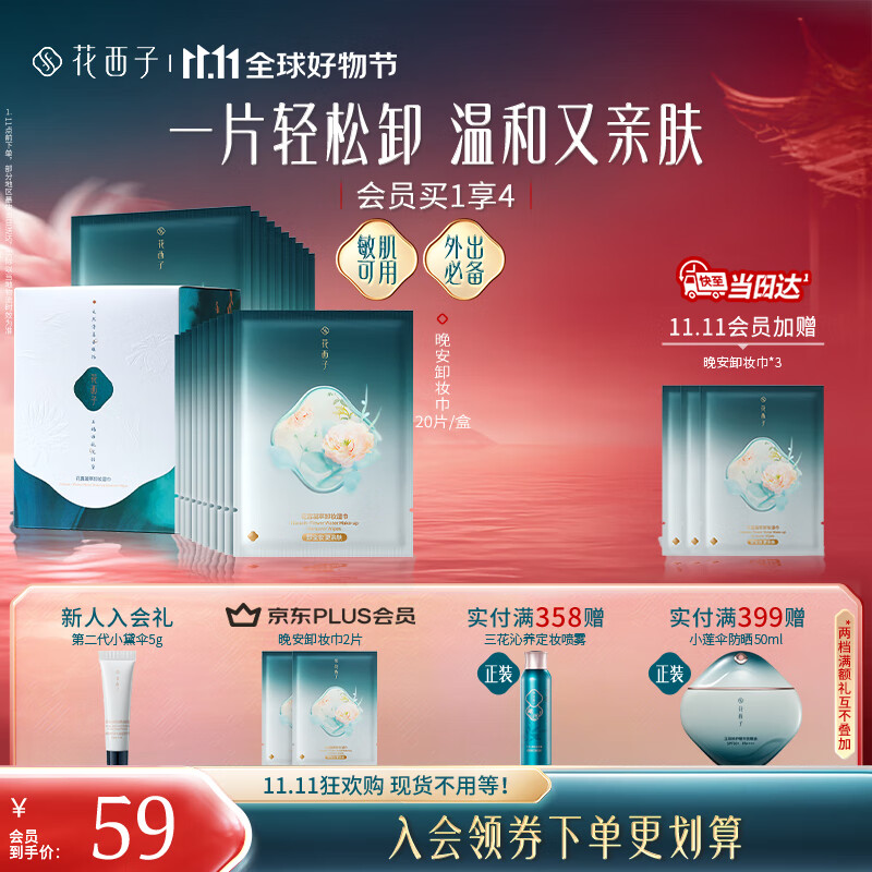 花西子【双11抢先购】花西子晚安卸妆湿巾23片免洗温和不刺激差旅便携