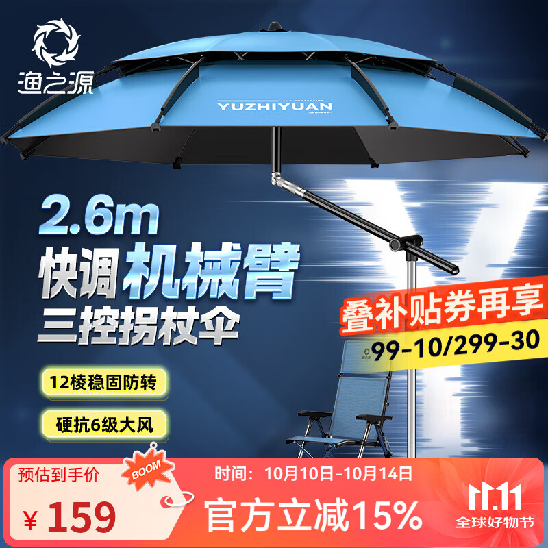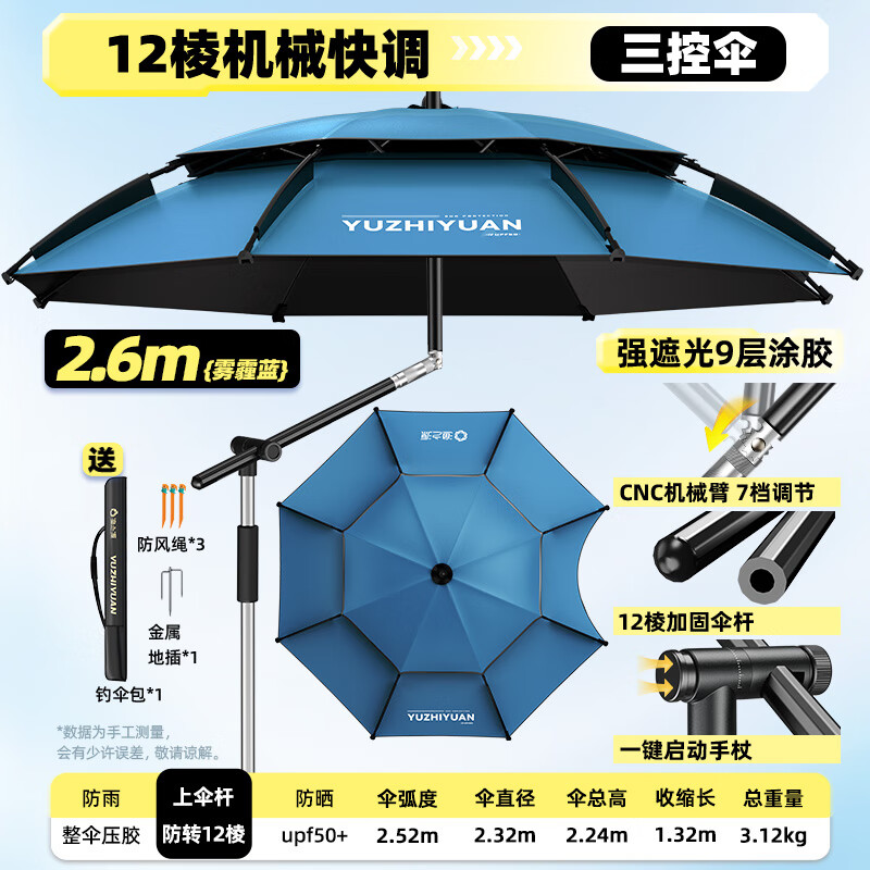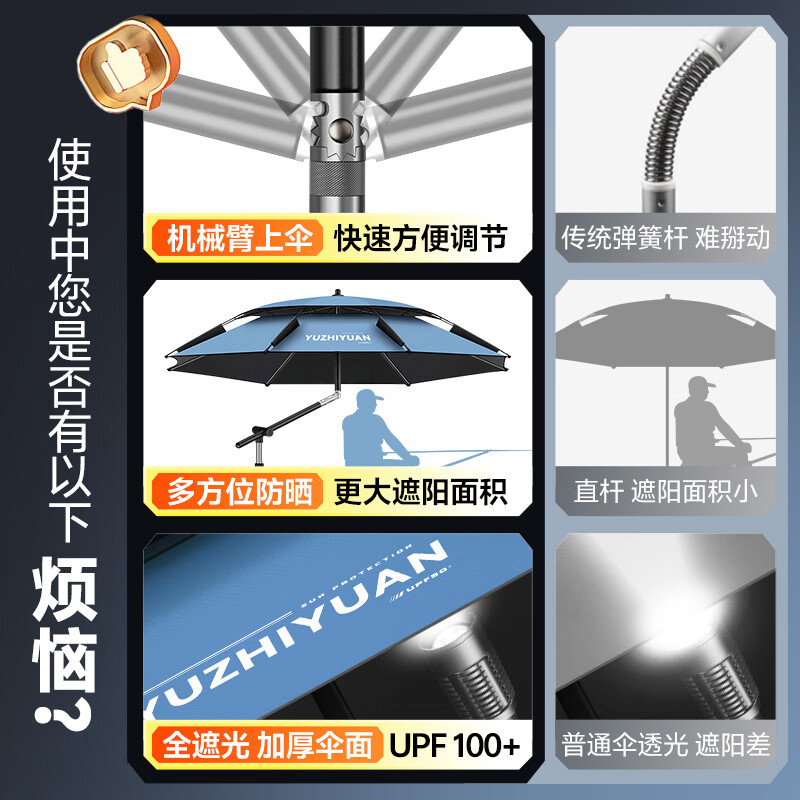 渔之源钓鱼伞2025新款加厚黑胶防转机械臂户外露营大钓伞遮阳防暴雨钓伞 2.6米 【黑胶防晒 7档机械臂拐杖】挪威蓝