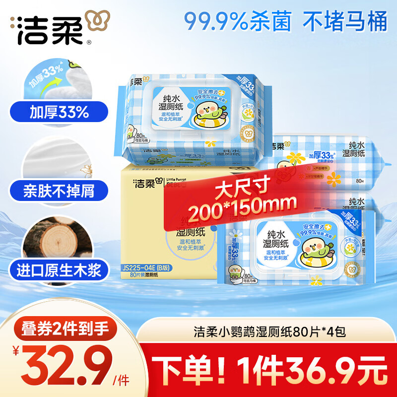洁柔小鹦鹉湿厕纸80抽*4包清洁湿纸巾家庭装湿巾搭配卷纸擦走细菌整箱