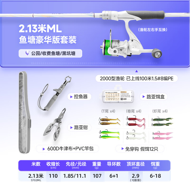 汉鼎鱼竿路亚竿套装新手小白竿碳纤维鱼杆手杆钓鱼竿渔具套装 2.13m
