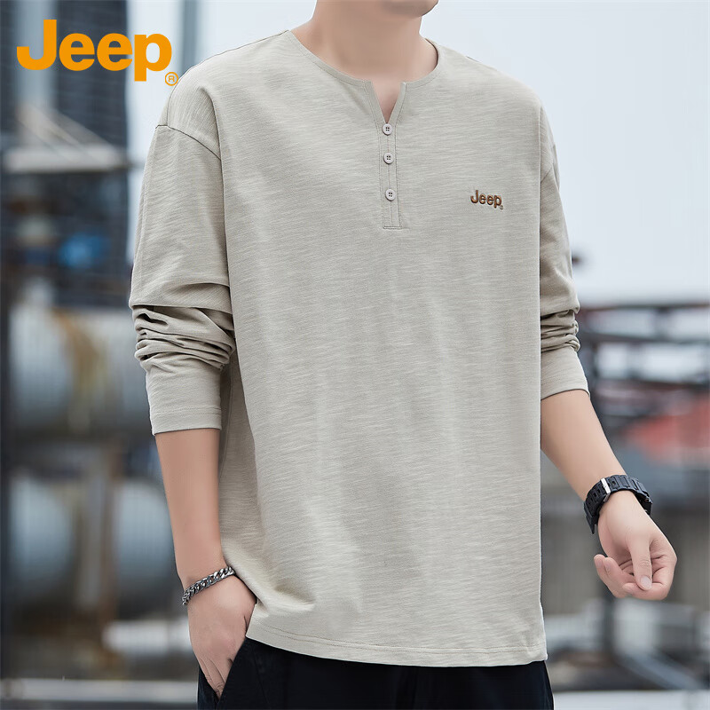 吉普(JEEP)长袖T恤男春秋季纯色休闲宽松打底衫潮流上衣男装 杏色 XL