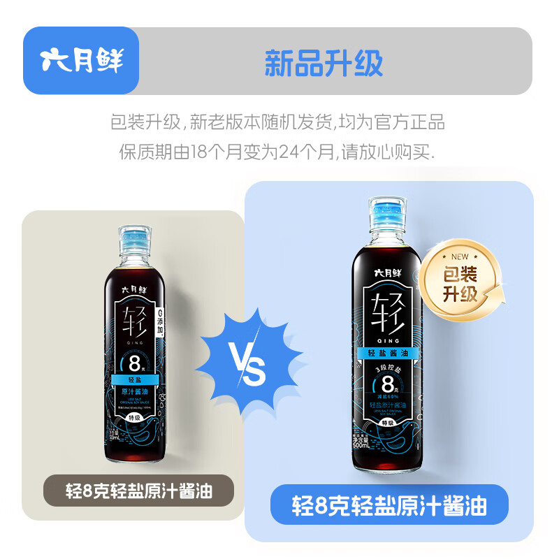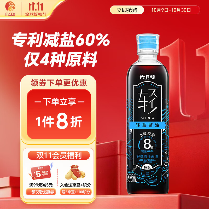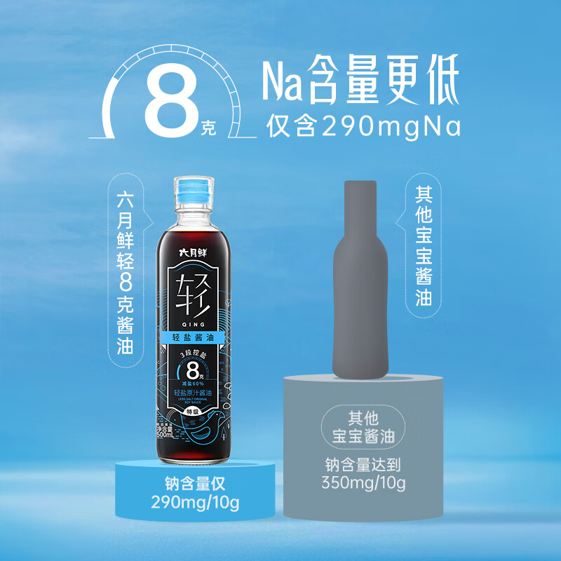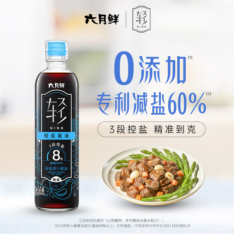 六月鲜轻系列8克轻盐原汁酱油500ml【减盐 特级酱油】生抽拌饭 欣和出品