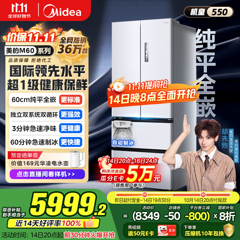 美的(Midea)M60机皇550法式多门超薄纯平全嵌一级除菌净味大容量家用制冰冰箱双系统MR-550WUFIPZE国家补贴