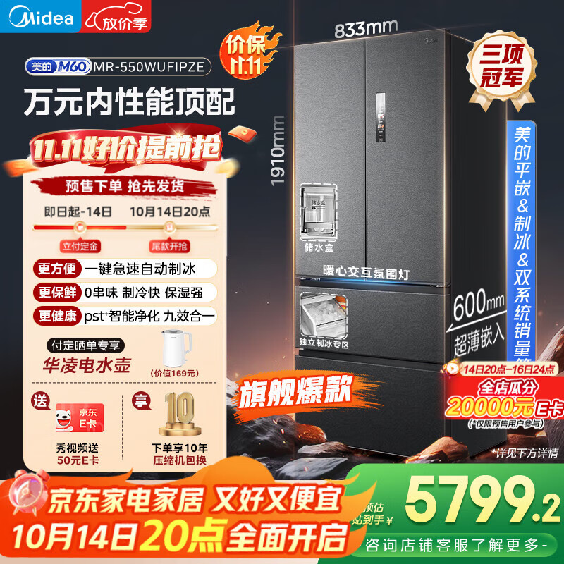 美的(Midea)机皇550法式多门超薄纯平全嵌一级除菌净味双系统大容量家用制冰一体机冰箱MR-550WUFIPZE海贝黛