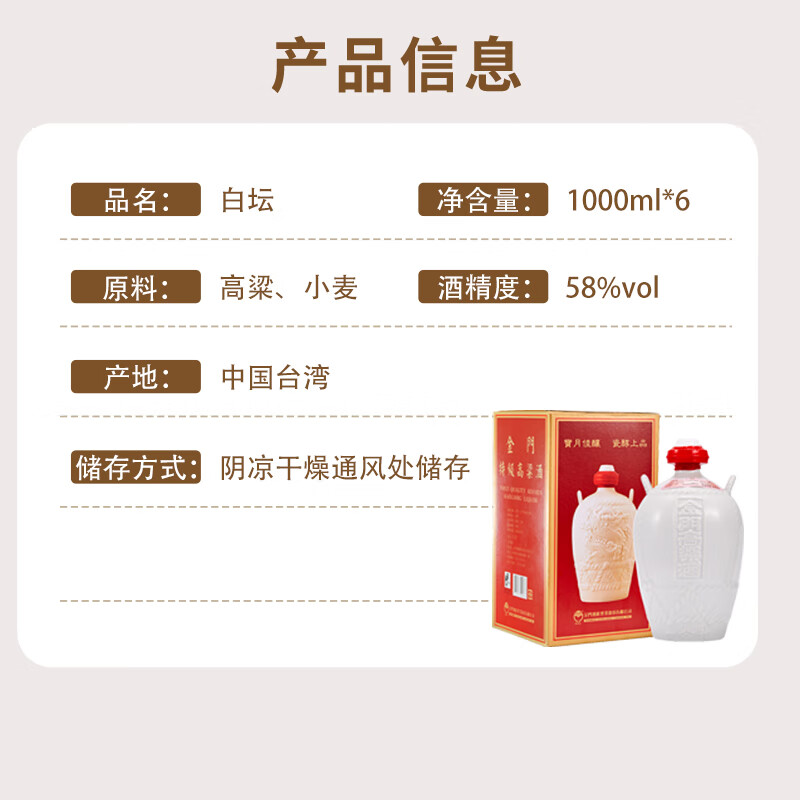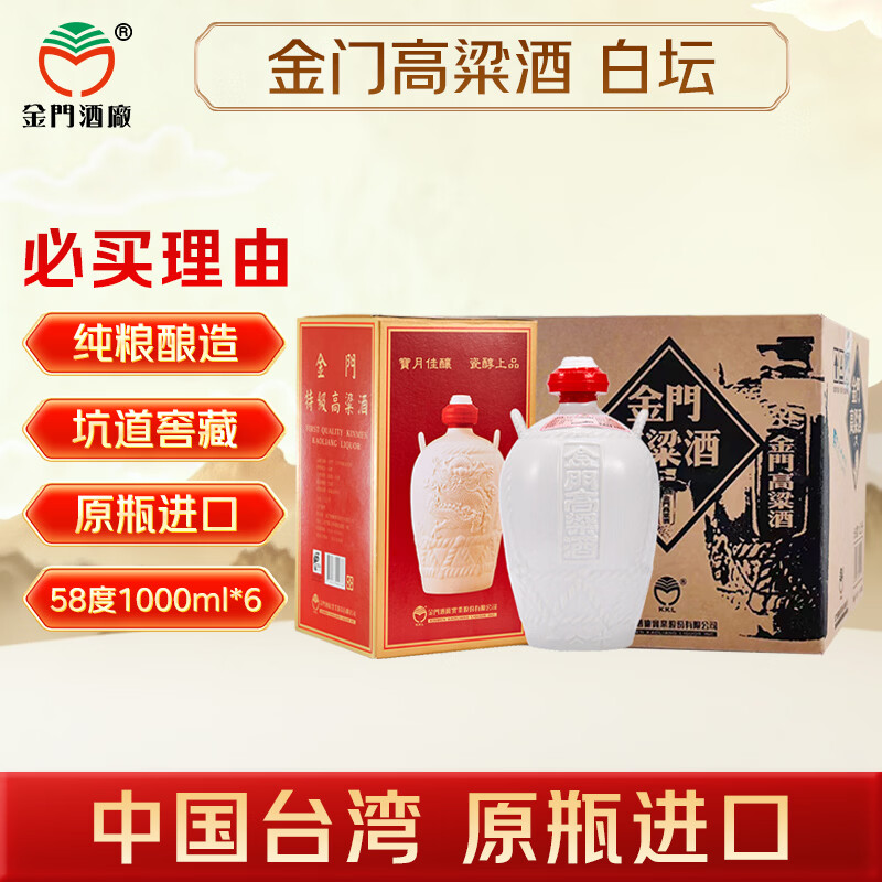 金门高粱 白坛 清香型白酒 58度1000ml*6坛 整箱装 台版原瓶