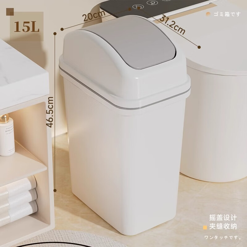 飞达三和垃圾桶卫生间摇盖带盖家用厕所客厅大容量夹缝窄缝翻盖垃圾桶纸篓 白灰摇盖款【15L】+40只垃圾袋