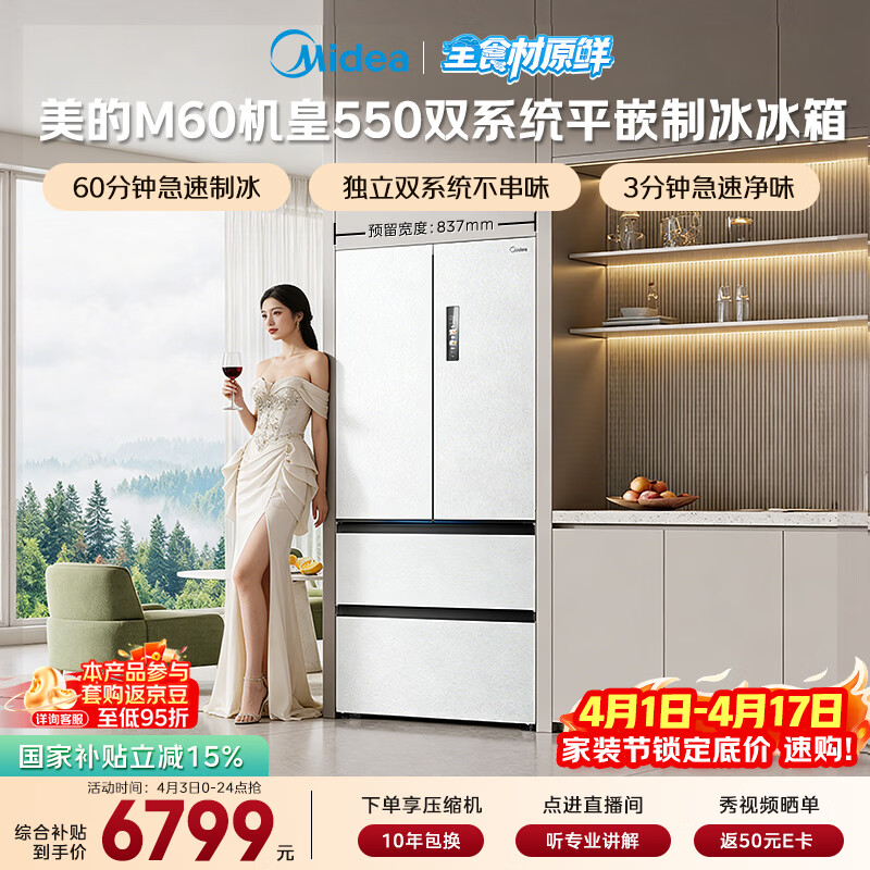 美的(Midea)M60机皇550法式四开门冰箱523L大容量超薄嵌入式双系统除菌一级能效制冰白MR-550WUFIPZE国家补贴