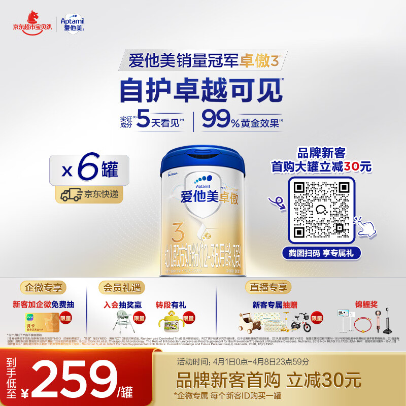 爱他美(Aptamil)爱他美 卓傲幼儿配方奶粉 3段(12-36个月) 800g*6罐 益生元
