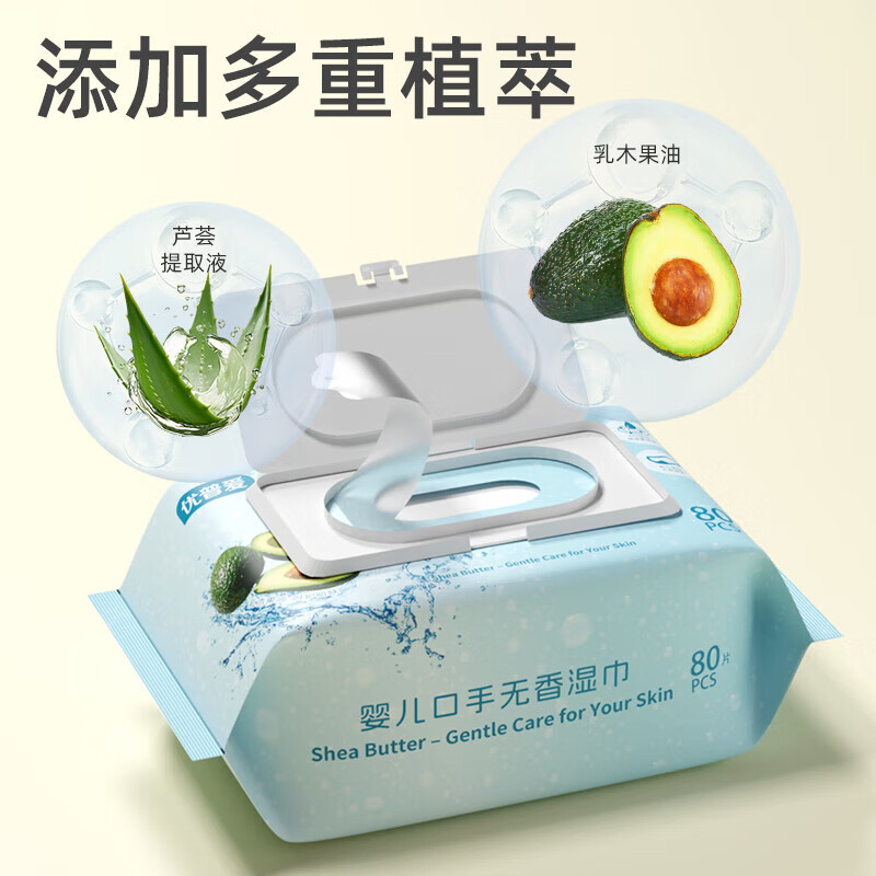 优普爱婴儿口手湿巾80抽医护级认证EDI纯水牛油果滋润亲肤 80抽*2包