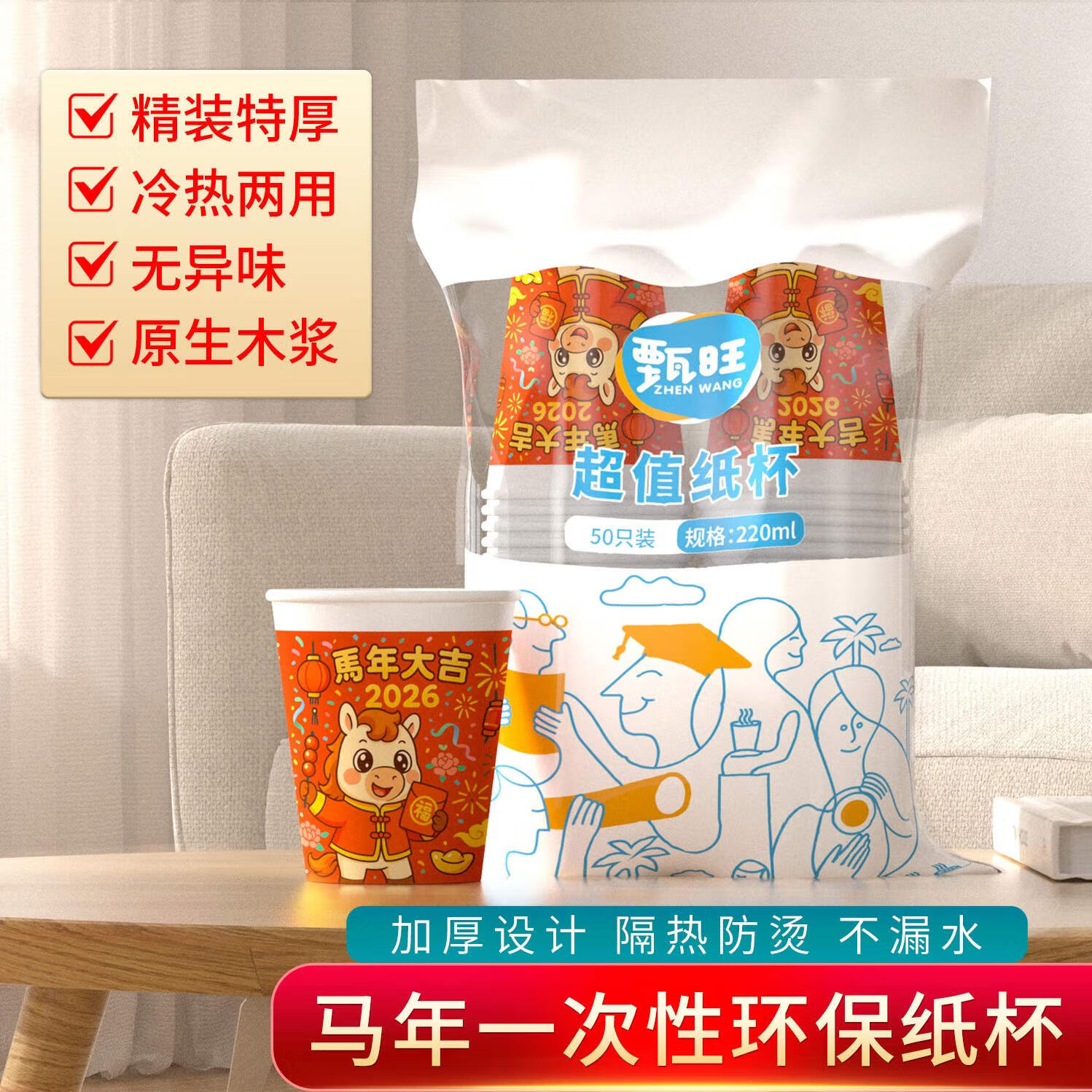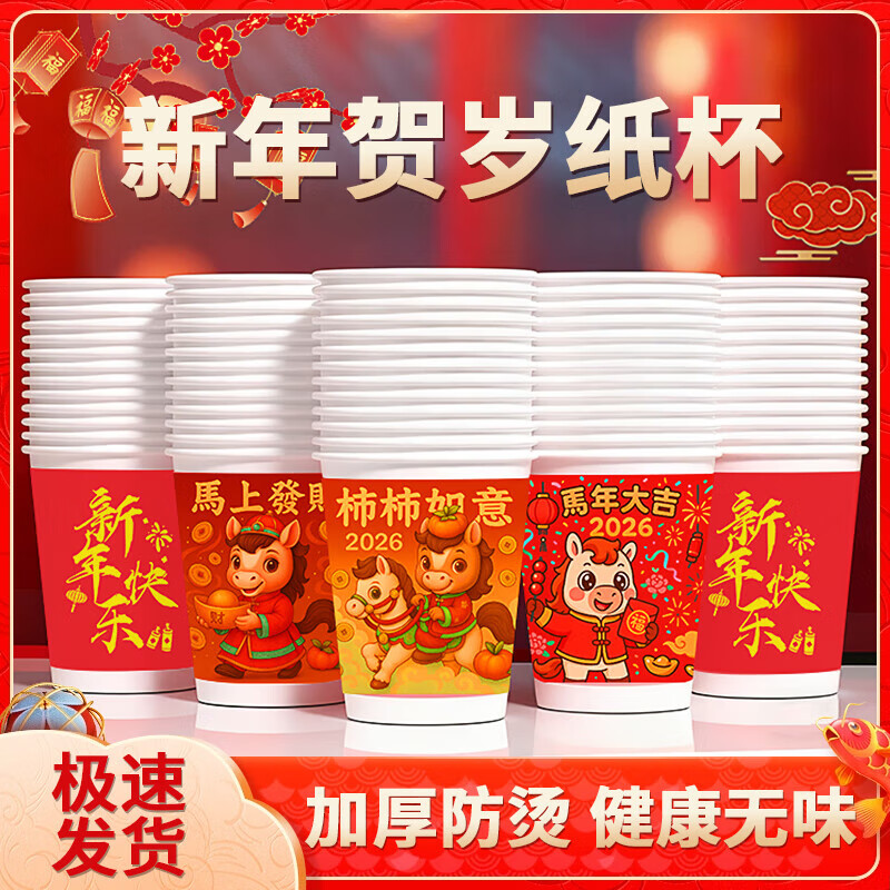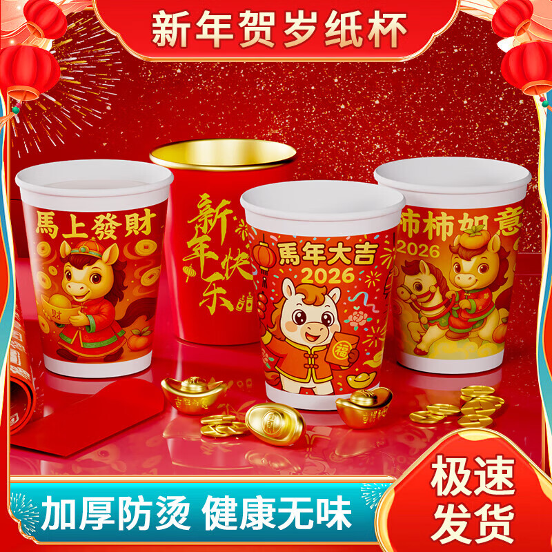 纸杯子一次性水杯加厚家用茶杯高档新年春节过年2026新款马年 马年大吉【220ml】 【2包100只】体验装