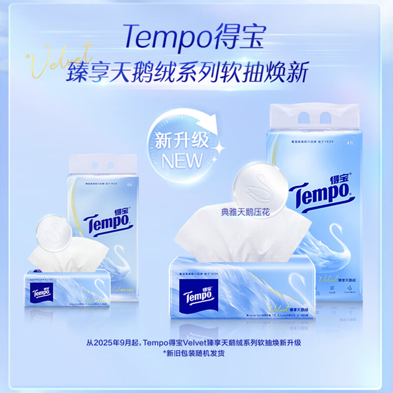 得宝(TEMPO)Velvet臻享天鹅绒软抽 4层80抽*4包/提 纸巾 餐巾纸 面巾纸