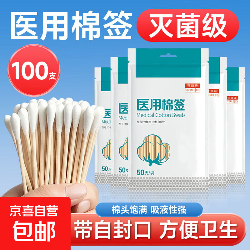医用无菌消毒棉签一次性脱脂棉花棒上药掏耳朵清洁成人婴儿小包装 【灭菌级10cm】100支【单头棉签】