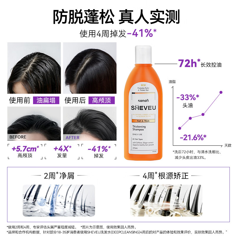 SHEVEU赛逸防脱橙瓶男女洗发水375ml二硫化硒去屑止痒生姜咖啡因selsun