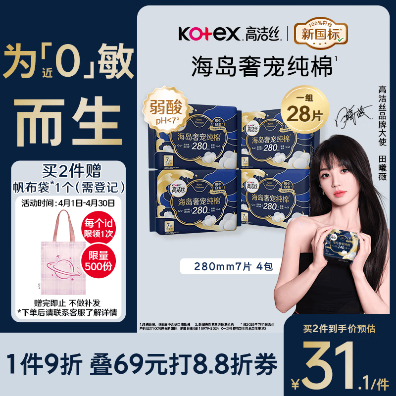 高洁丝【近0敏海岛棉】奢宠纯棉卫生巾280mm7片 *4包日用姨妈巾京东自营