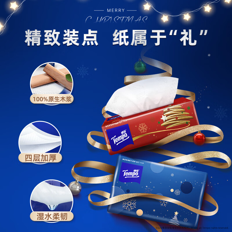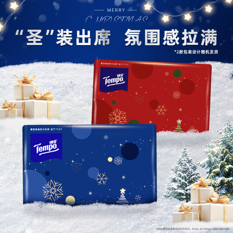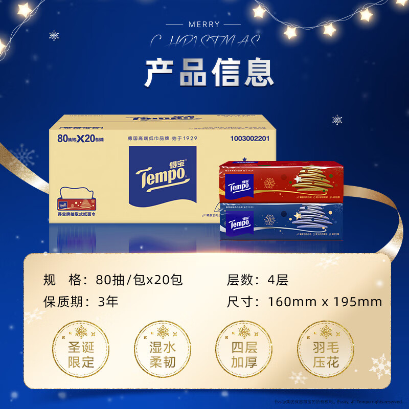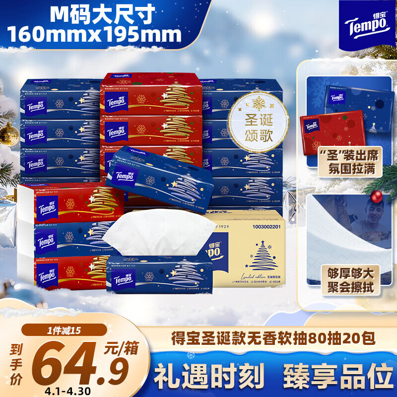 得宝(TEMPO)圣诞款限定抽纸 4层加厚80抽*20包 无香软抽 纸巾餐巾纸 真M码