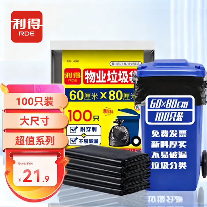 利得平口垃圾袋黑色60*80cm100只单面1丝超值装大号物业袋桶分类