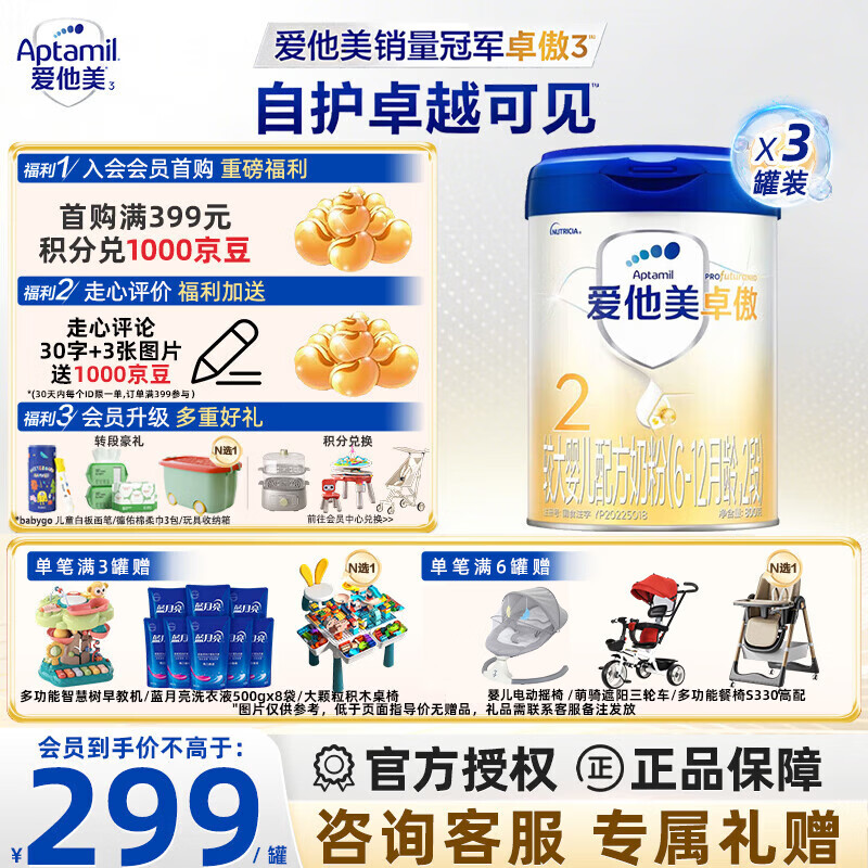 爱他美(Aptamil)卓傲2段较大婴儿配方奶粉(6—12月) 800g*3罐(0元入会)