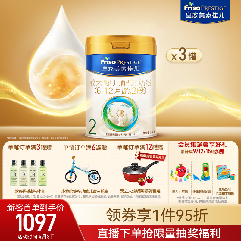 美素佳儿(Friso)皇家较大婴儿配方奶粉2段(6-12个月)800克*3罐 乳铁蛋白