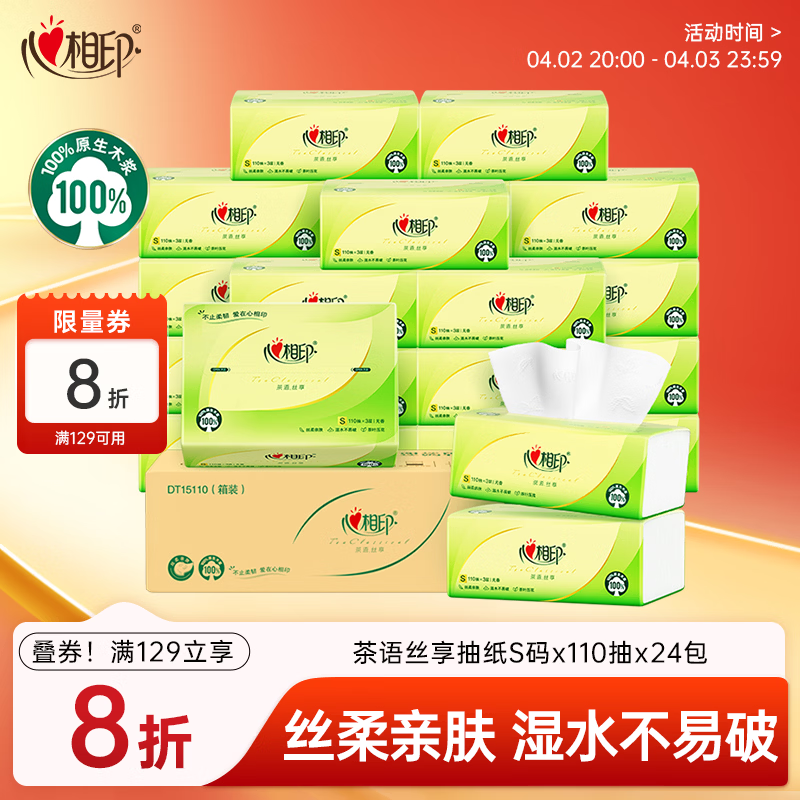 心相印抽纸 面巾纸 茶语丝享 3层110抽*24包真S码 纸巾(整箱销售)