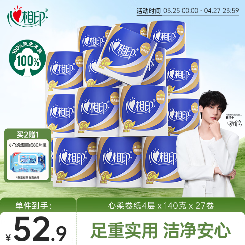 心相印卷纸 心柔 有芯4层140g*27卷 柔韧卫生纸 可冲散 实惠整箱