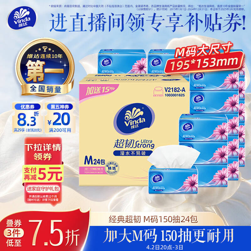 维达(Vinda)抽纸【孙颖莎推荐】超韧3层150抽*24包M码 纸巾卫生纸 餐巾纸整箱