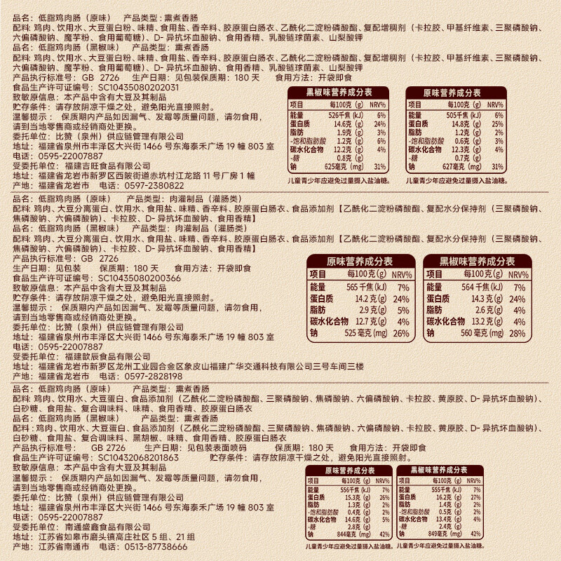 比比赞(BIBIZAN)低脂鸡肉肠500g鸡胸肉黑椒味即食高蛋白健身饱腹代餐火腿肠零食