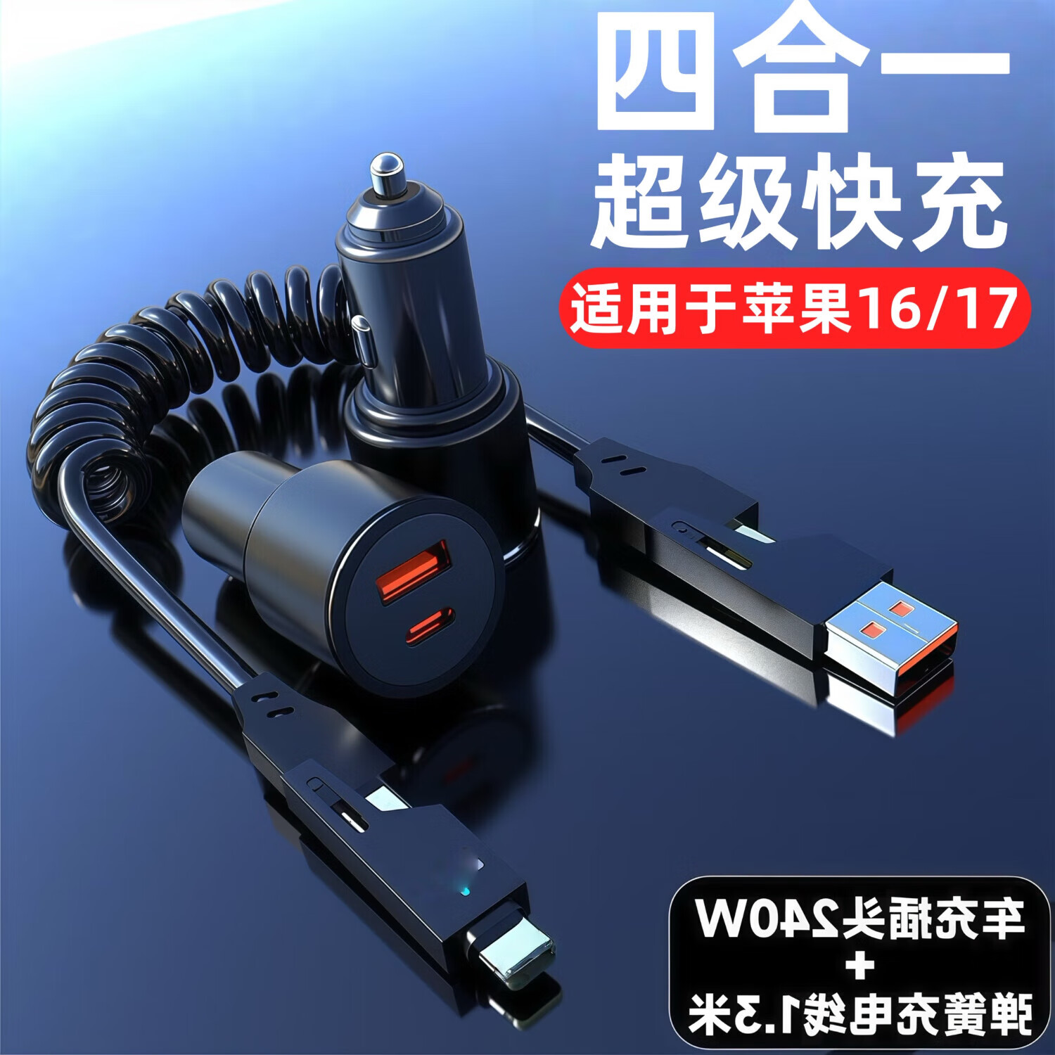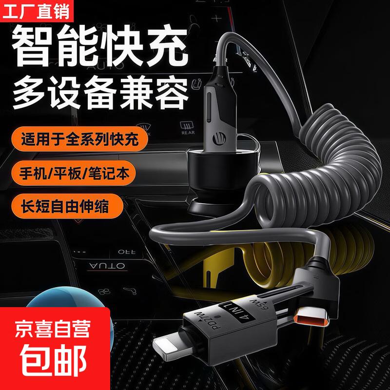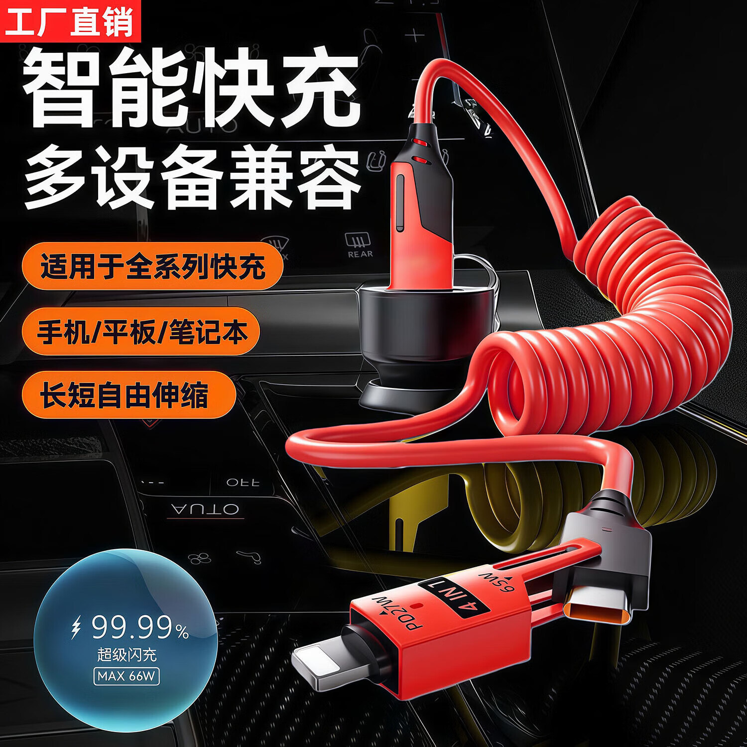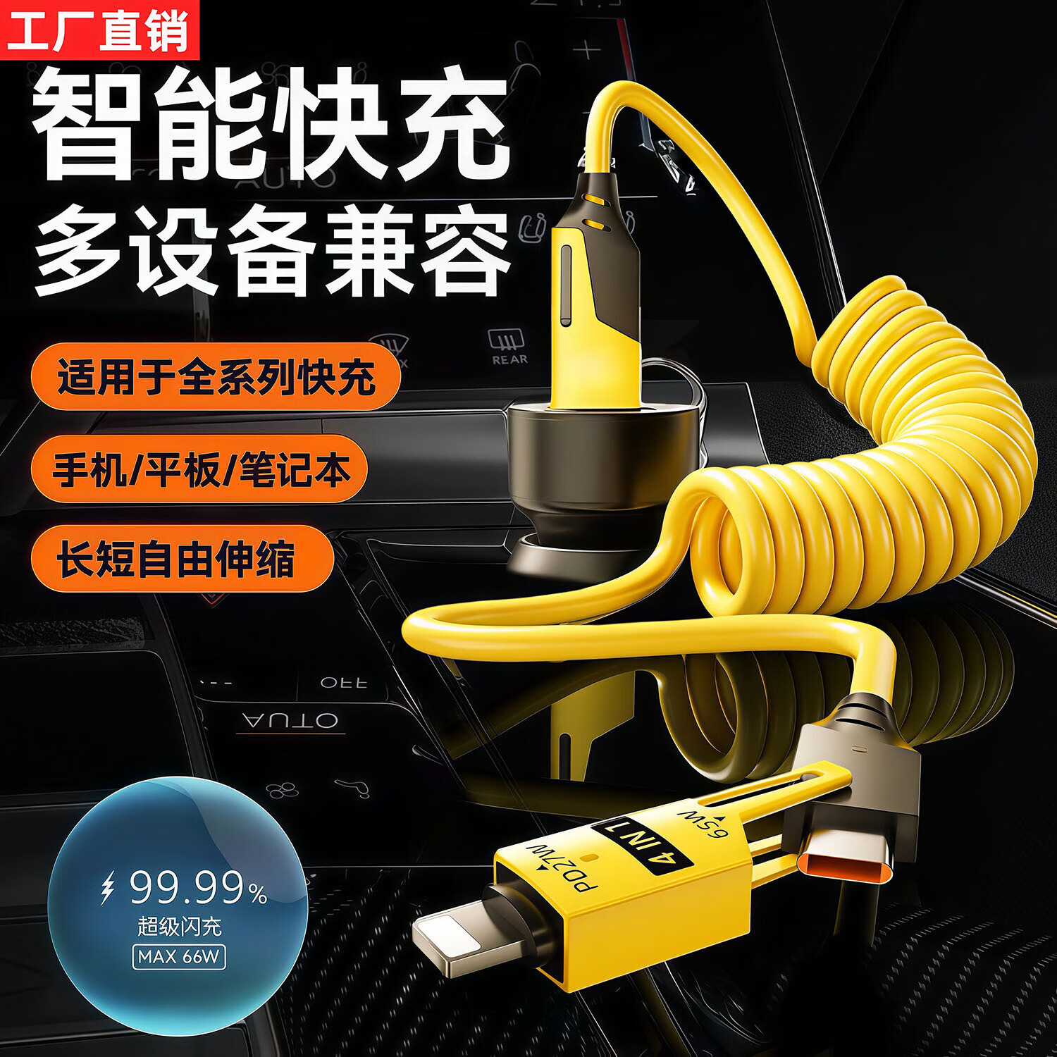 四合一弹簧数据线车载互联carplay大功率65W超级快充适用苹果15/16/17华为荣耀小米三星VIVO万能型 黑色 可拉至1.5米