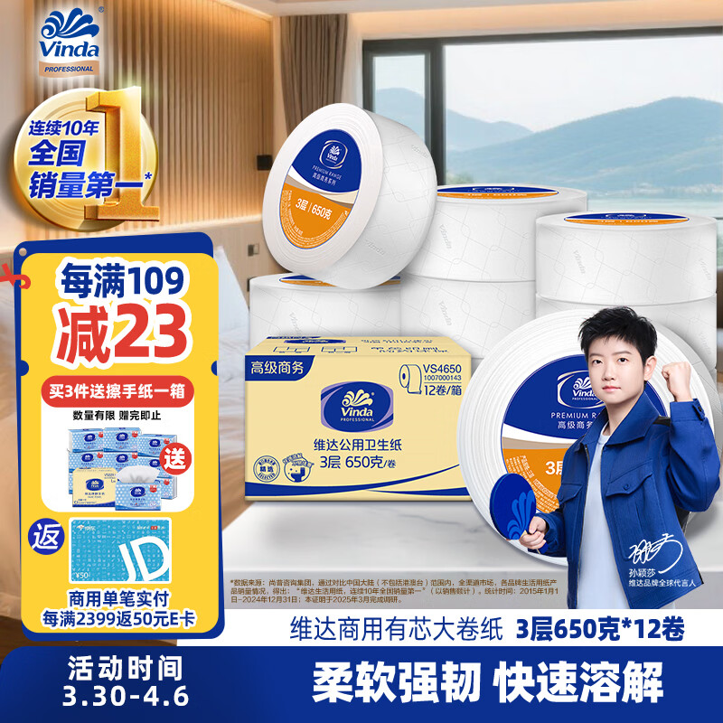 维达有芯大卷纸3层650克*12卷 大盘纸商场酒店厕纸 加厚整箱VS4650