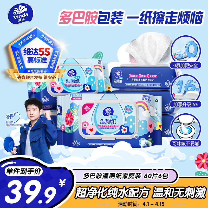 维达(Vinda)湿厕纸 家庭装60片*6包 多巴胺湿厕纸纯水湿纸巾厕纸湿巾新旧随机
