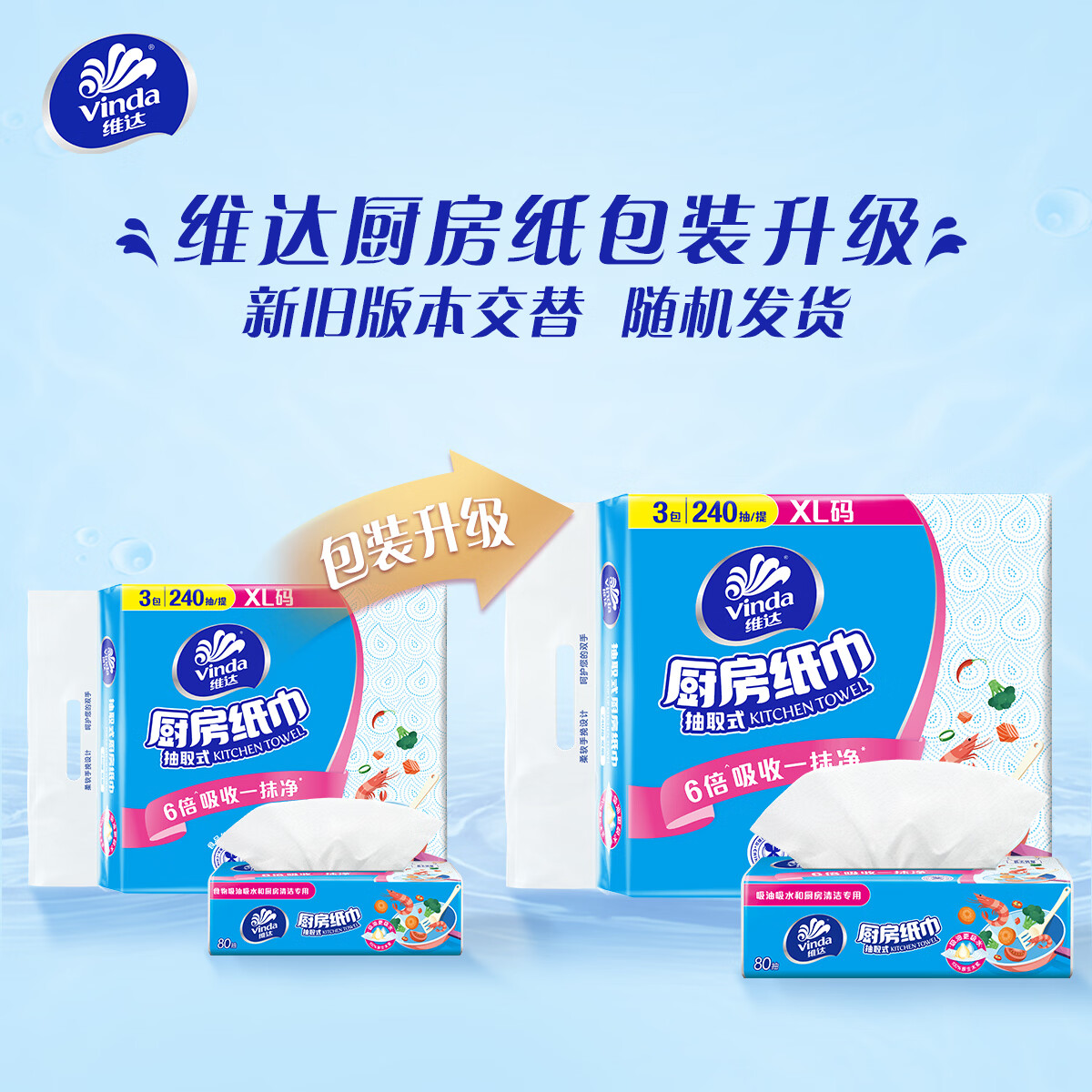 维达(Vinda)厨房用纸 抽纸80抽*3包 6倍吸油吸水 厨房纸懒人抹布吸油厨房纸