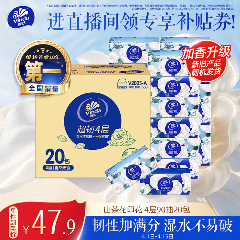 维达(Vinda)抽纸 超韧4层90抽*20包S码 山茶花印花纸巾 新旧随机发货 整箱