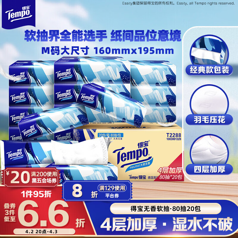 得宝(TEMPO)一博同款 抽纸无香4层80抽*20包M码 湿水不易破 纸巾 餐巾纸