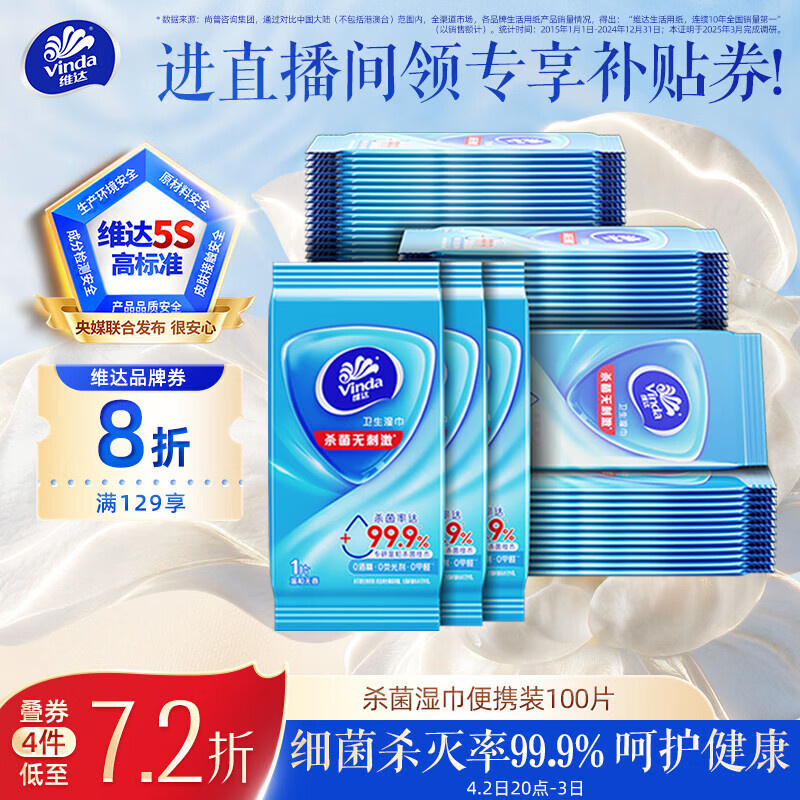 维达(Vinda)杀菌湿巾 10片*10包 湿巾小包独立便携装 湿纸巾 学生外出