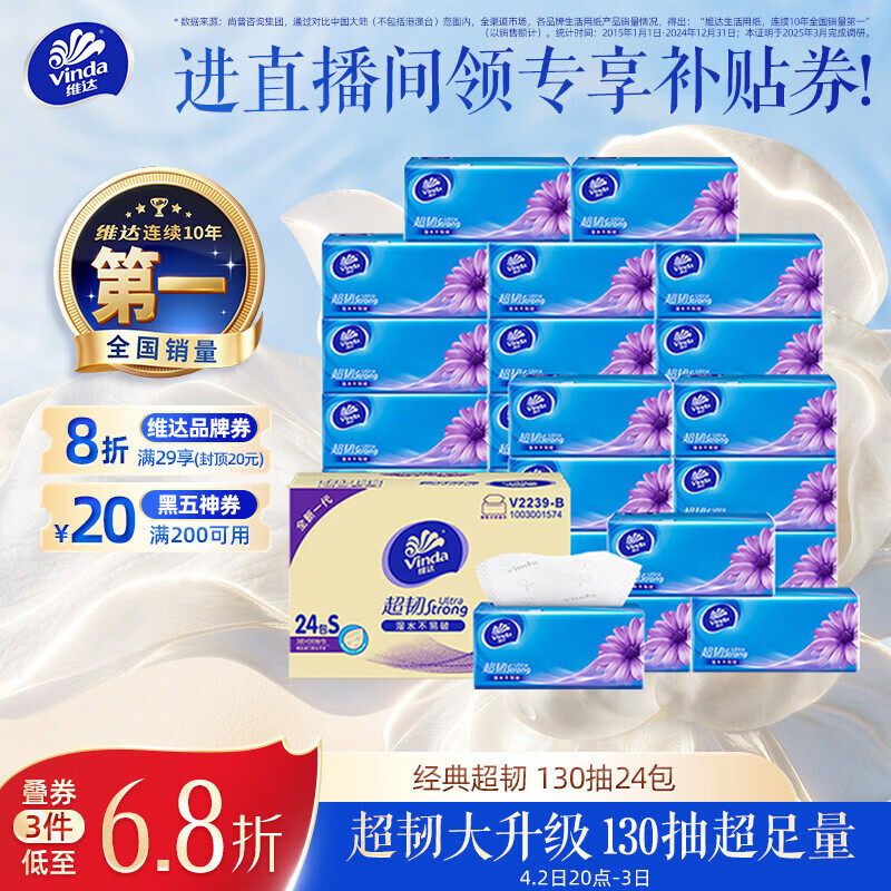 维达(Vinda)抽纸【孙颖莎推荐】超韧3层130抽*24包S码 纸巾卫生纸 餐巾纸整箱