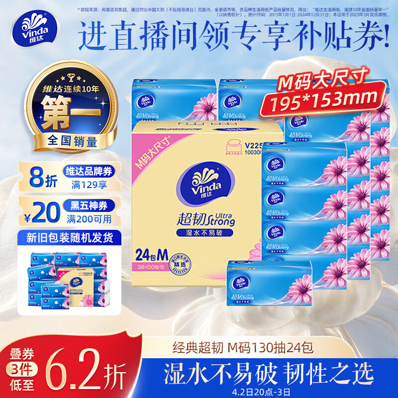 维达(Vinda)抽纸 【孙颖莎推荐】超韧3层130抽*24包M码 新旧随机 整箱