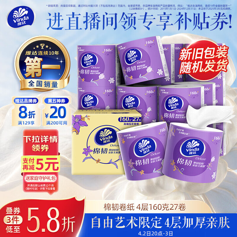 维达(Vinda)有芯卷纸 棉韧4层160克*27卷 卫生纸 厚韧耐用 新旧随机发货
