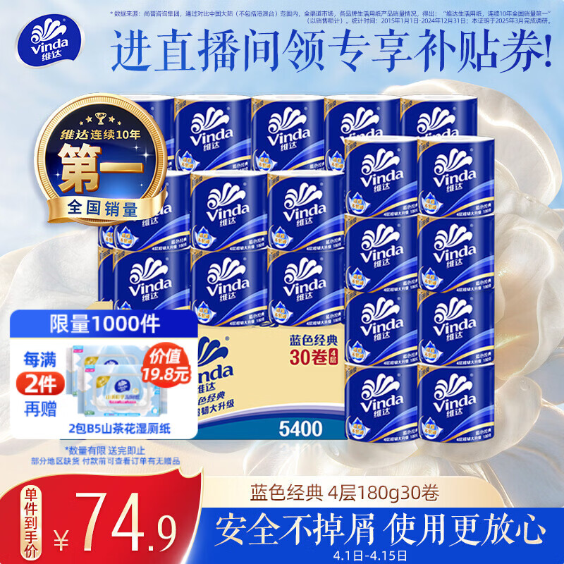 维达(Vinda)有芯卷纸 蓝色经典4层180克*30卷 加厚 纸巾 整箱