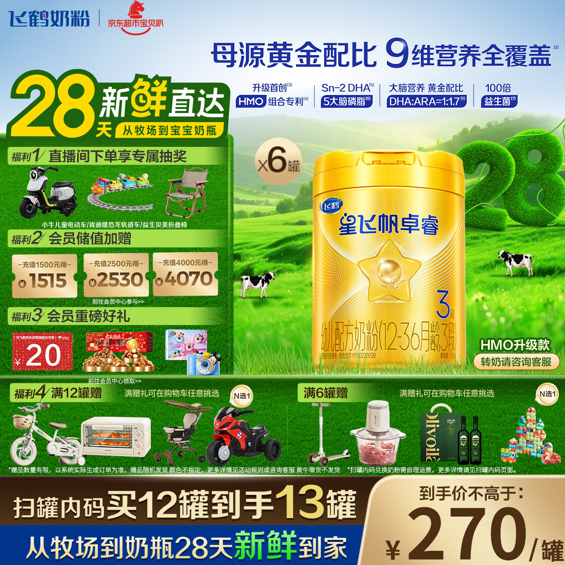 飞鹤星飞帆卓睿 3段幼儿配方奶粉(1-3岁)750g*6罐 HMO 28天新鲜直达