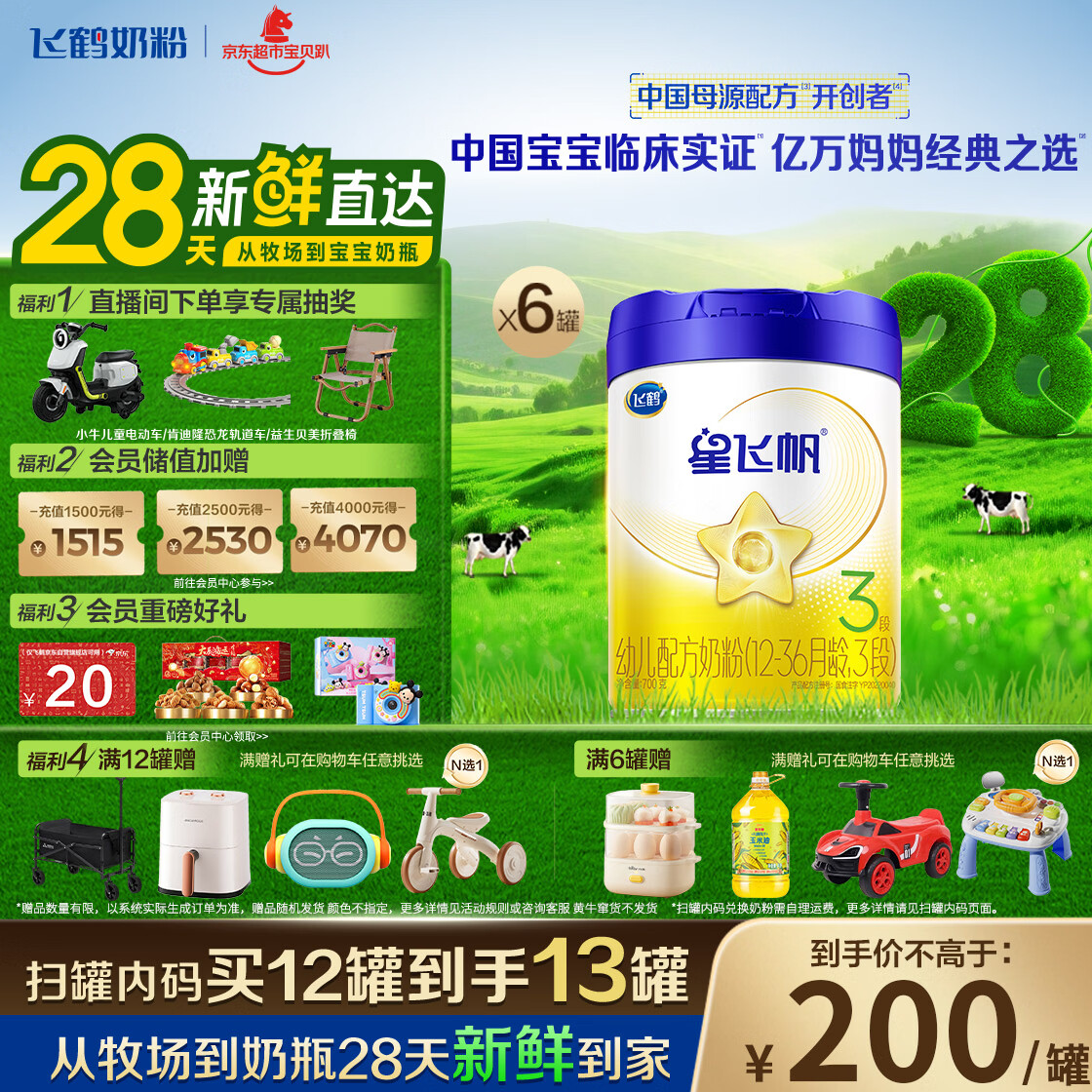 飞鹤星飞帆幼儿配方奶粉3段(1-3岁)700g*6罐 28天新鲜直达