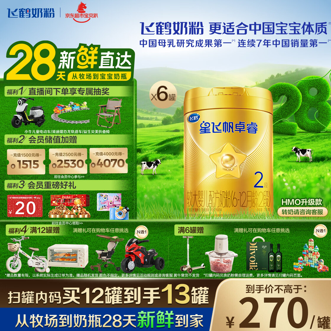 飞鹤星飞帆卓睿HMO 婴儿配方奶粉2段(6-12月)750g*6罐 28天新鲜直达